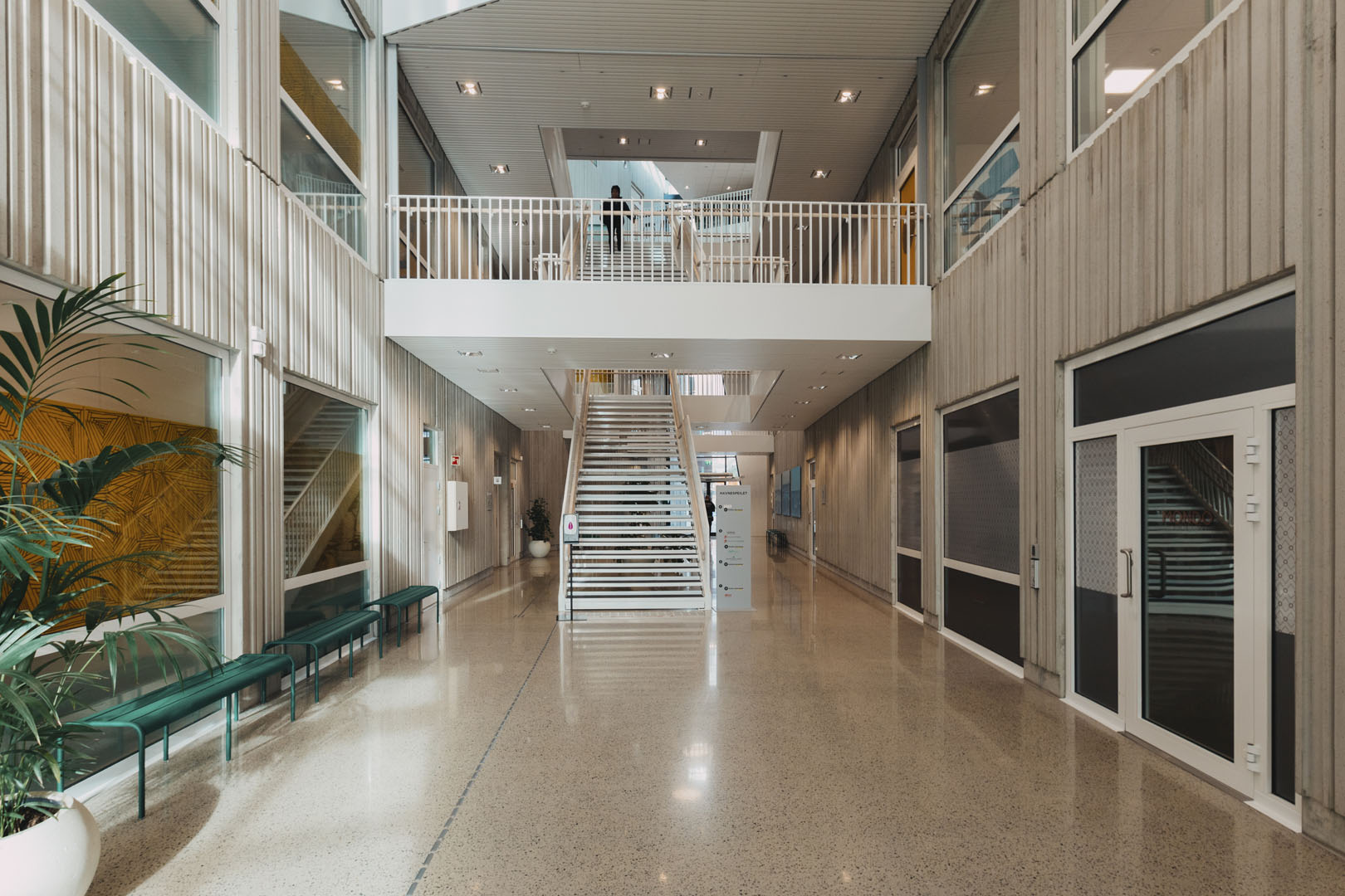 - Vegger inne i gang i grå betong støpt mot relief, vertikale profil spor nedsenket i betongen.